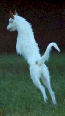 The Joy of the Breed When living with Ibizans, the owner must be aware that his dog's reach, unlike most breeds, extends vertically. Ibizans are perfectly comfortable leaping up onto kitchen counters, hopping over child-proof gates, and cleaning off the top of the refrigerator. Just as one plans the environment carefully for safe puppy care, be sensible about where you put food and fragile items if you do not plan to stay in the room with the young adult Ibizan. Another approach would be to plan training sessions to prevent this behavior (see People, Pooches and Problems, cited below). Why one would want to train an Ibizan not to leap up is a mystery to their true fanciers, however. The ideal Ibizan owner interprets his dog's prowess in scaling domestic heights as a sign of beauty, athleticism, and intelligence. |