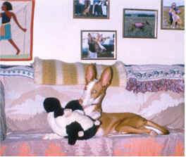 Ibizan Hounds must never be struck or kicked as discipline. Sensitive and intelligent, they quickly develop an exaggerated startle reflex when handled roughly. Any dog that has endured this is ruined for canine sports, where trust and teamwork between dog and handler are so critical. A well-timed verbal reprimand with a cooling-down period of no more than 20 minutes in another room or crate will communicate your displeasure. Even more effective is to provide an alternative activity for the forbidden one; e.g., offer a chew toy when puppy munches on the chair leg. Ibizan Hounds are truly loyal, and are eager to live within the rules, once those rules are made clear to them. Thinking of discipline problems as miscommunication between you and your dog often gives you the clue to a simple and peaceful solution. |